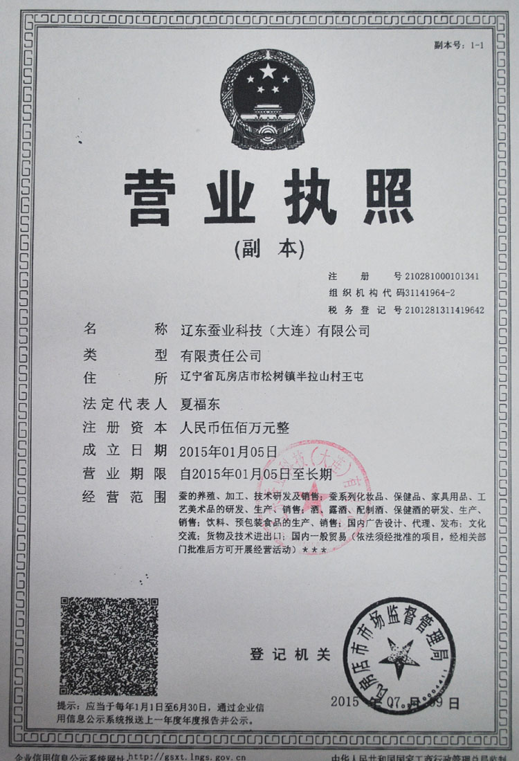 榮譽資質 證書介紹 遼東蠶業科技有限公司坐落于素有北方明珠之稱的遼寧省大連市,是一家以柞蠶養殖、研發、生產、銷售及文化交流為一體的大規模實業公司,公司產品涉及酒業、食品、保健品、化妝品、家居用品等多個領域,自上市以來,其各產品受到了客戶的一致認可和好評。