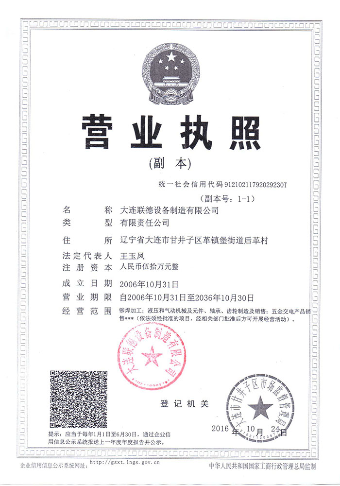 證書(shū)介紹 大連聯(lián)德設(shè)備制造有限公司是一個(gè)以機(jī)械設(shè)備及液壓系統(tǒng)設(shè)計(jì)制造為一體的綜合型民營(yíng)企業(yè)。