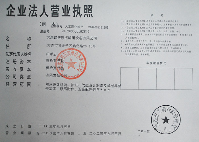 證書介紹 大連銘盛液壓潤滑設備有限公司是一家集設計研發、生產加工、經營銷售、技術服務于一體的液壓產品綜合性企業。