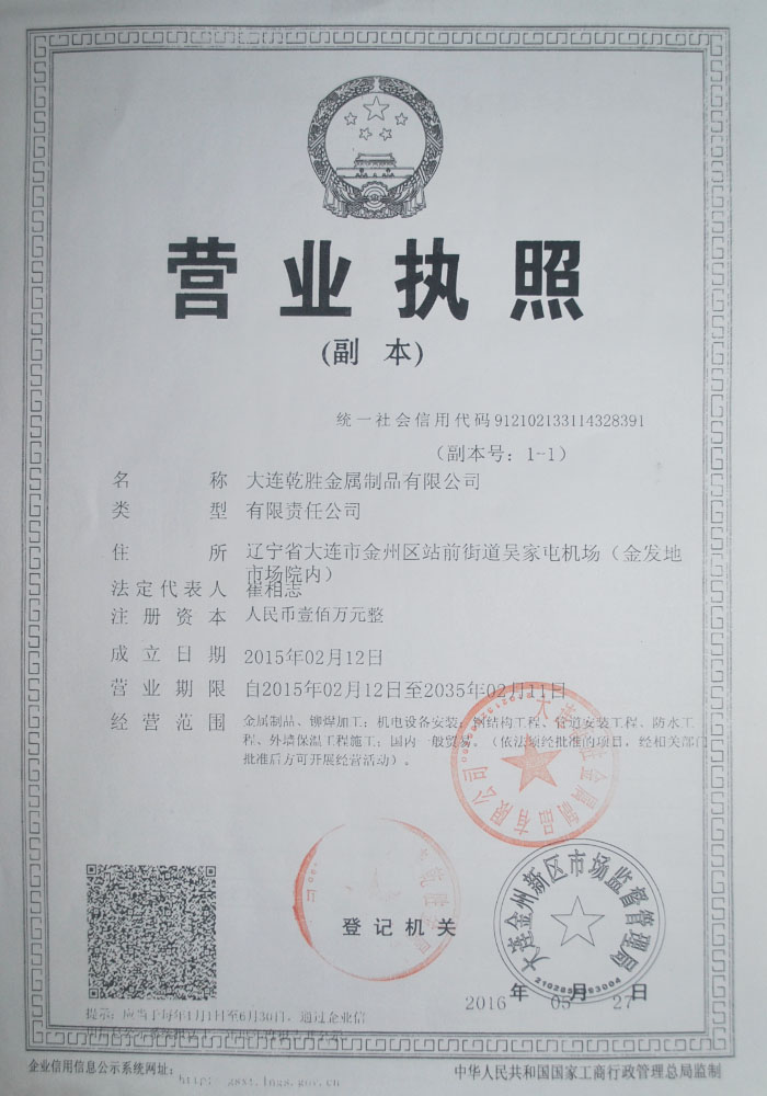 發(fā)證機(jī)構(gòu): | 大連市金州區(qū)工商廳政管理局 | 發(fā)證時間 : | 2015-02-12 |