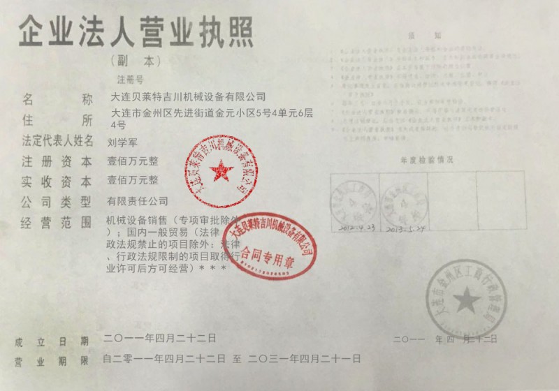 發證機構: | 大連市金州區工商行政管理局 | 發證時間 : | 2011-04-22 |