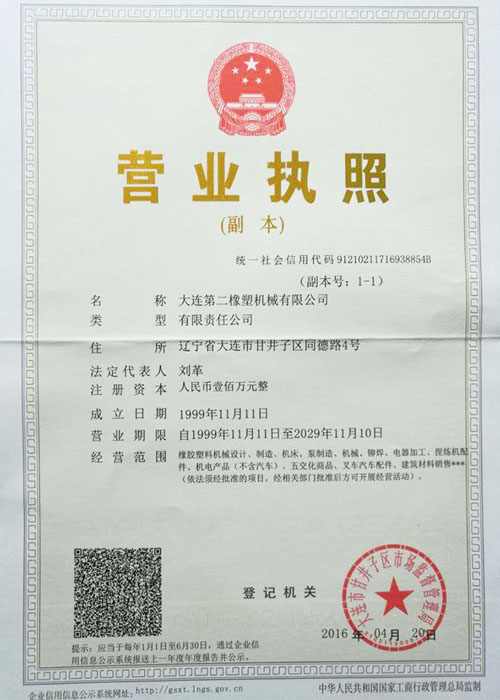 證書介紹 大連第二橡塑機械有限公司,成立于1999年,公司位于大連市甘井子區,占地面積15,0000平方米,職工總人數530人,工業總產值:1.5億元。