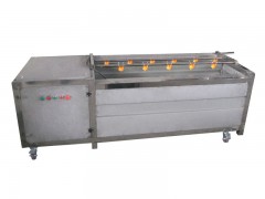 將根莖類蔬菜或球類果品放置在幾根可滾動的毛輥組成的U型料斗里使物料與旋轉的毛輥接觸產生表面摩擦,從而使物料達到清洗脫皮的。清水從噴淋水管中噴出以沖洗物料,從而達到洗凈的目的。 也可在機器底部加裝廢料收集盤,防止污水皮屑等污染地面。
